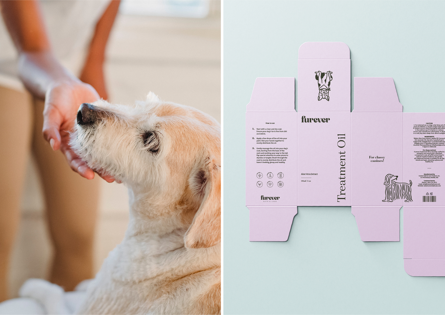 The visual identity we've crafted for Furever brings an elegant yet friendly aesthetic, with simple and playful illustrations. The logo and typography complement each other by bringing the sophistication of a cosmetics brand while still keeping the comfort that a pet brand should embody.