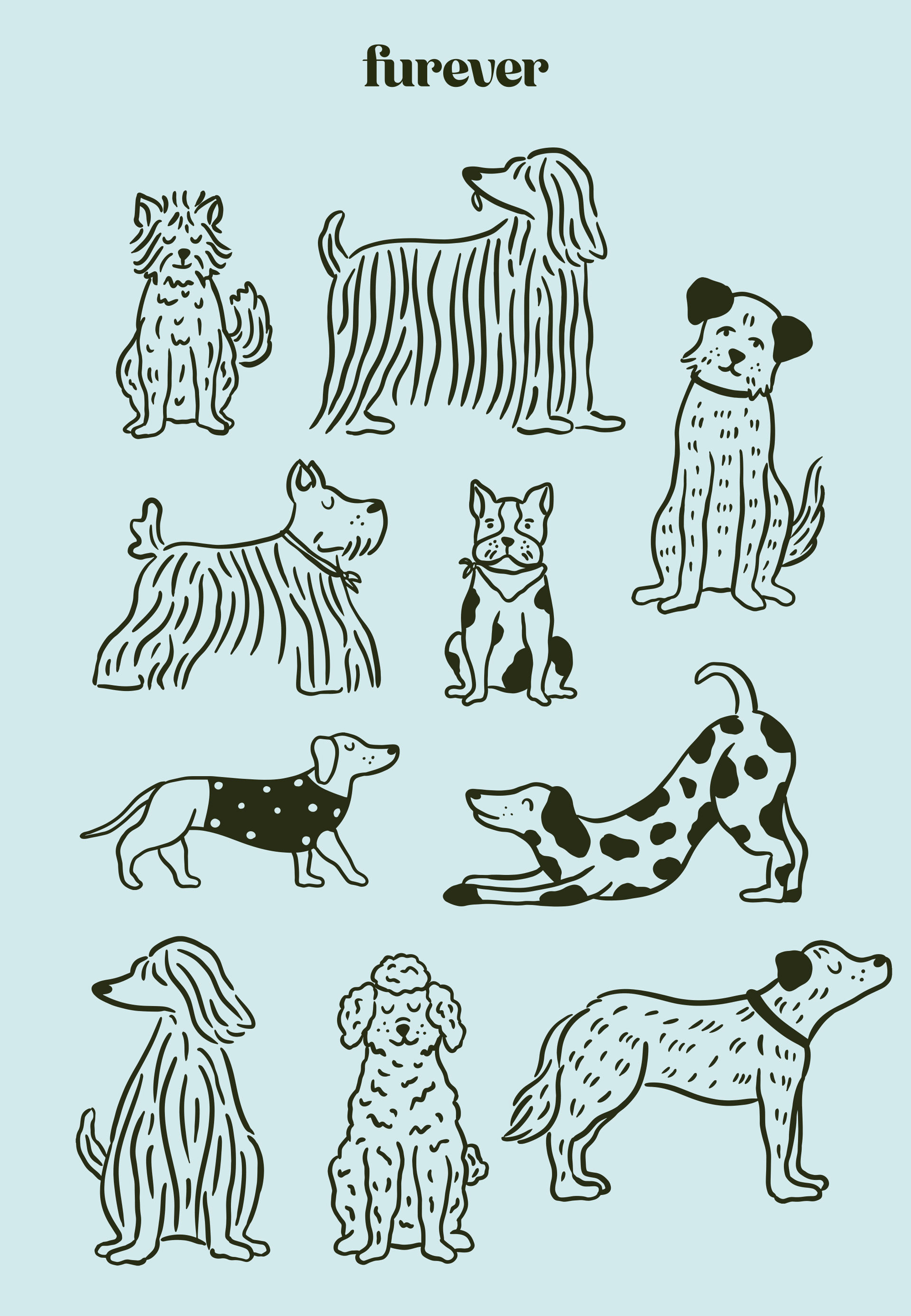 A Identidade visual que criamos para a Furever traz uma estética elegante, mas amigável, com ilustrações simples e divertidas. O logotipo e a tipografia se complementam para transmitir a sofisticação de uma marca de cosméticos, sem perder o acolhimento que uma marca para cachorros deve ter.